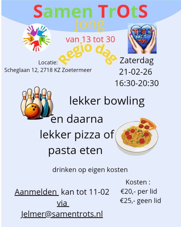 De jongeren hebben gekozen om te gaan bowlen en daarna wat te eten met elkaar. We gaan naar Zoetermeer waar we eerst een uurtje gaan bowlen daarna gaan we gezellig met elkaar Pizza of pasta eten in een restaurant vlakbij de bowlingbaan.