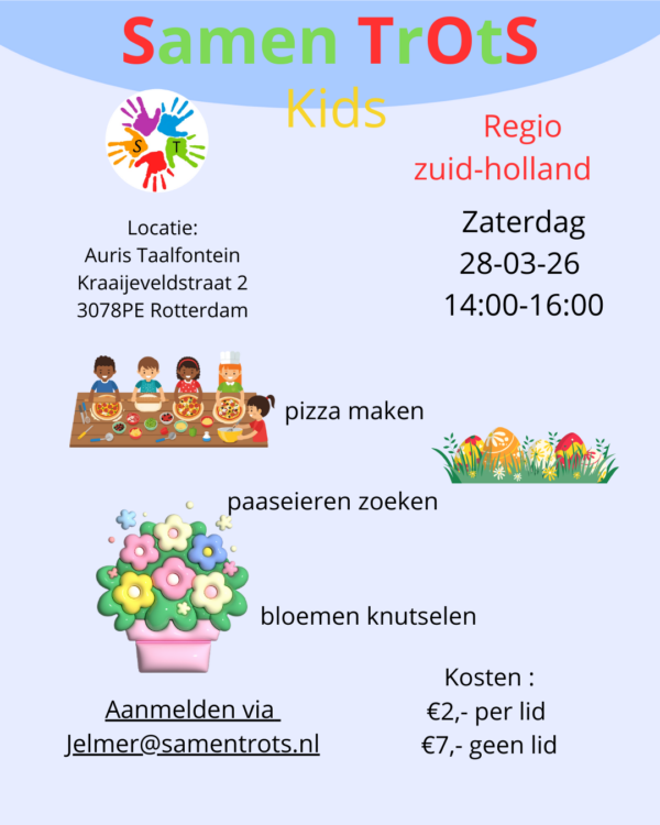 Een reguliere bijeenkomst voor kinderen vanaf 5 jaar en hun ouders. Wat we gaan doen, daar zijn we nog mee bezig. Heb jij een leuk idee laat het ons dan weten via jelmer@samentrots.nl